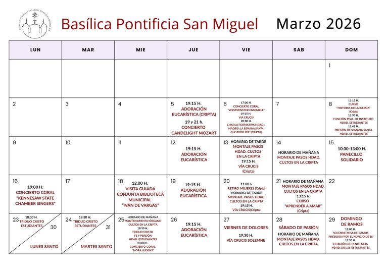 Todas las actividades de la Basílica en el calendario mensual de Marzo de 2026
